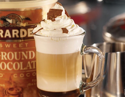 Milch schäumen und etwas abkühlen lassen. Die Schokoladensauce in das Glas füllen und die etwas abgekühlte Milch vorsichtig einfüllen. Danach langsam den Espresso einfüllen. Mit Schlagsahne auffüllen und mit Schokoflocken verzieren.